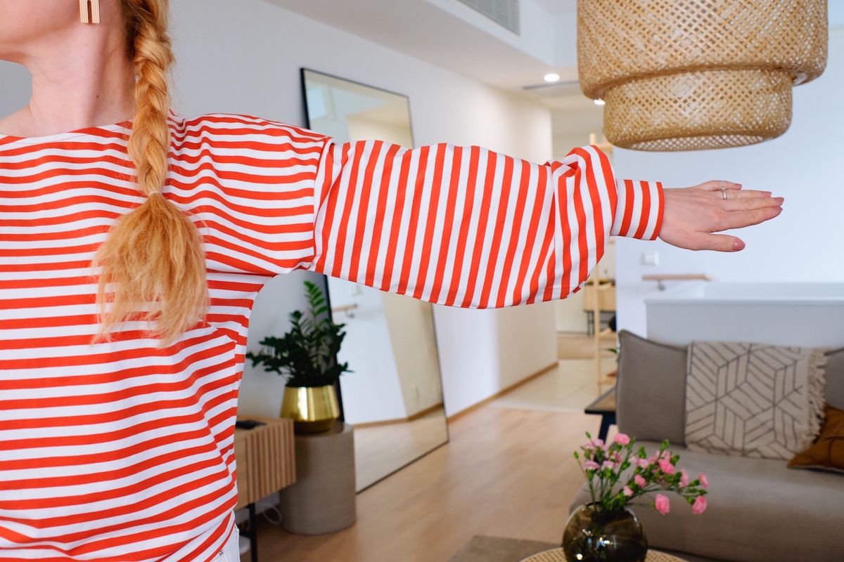 Kumpikin meistä valitsi punaokran värisillä raidoilla varustetun Sohvi-trikoopuseron, jonka puhvihihat tekevät vaatteesta persoonallisen. Paita on myös mukavan väljä, joten se päällä on rento olo myös Wolt-lounaan supermakean (ja ison) jälkkärikakkupalan jälkeen.