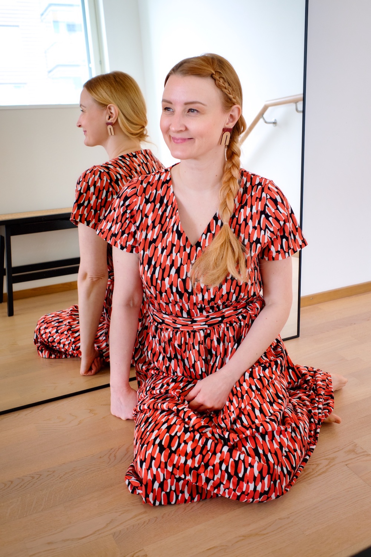 Jenni ihastui Kastepisara-mekossa siihen, että trikoomekko on päällä erittäin mukava ja näyttää silti kauniilta ja naiselliselta. Joka päivä ei tule vastaan trikoovaatetta, joka päällä voisi kuvitella menevänsä vaikkapa kesäjuhliin.