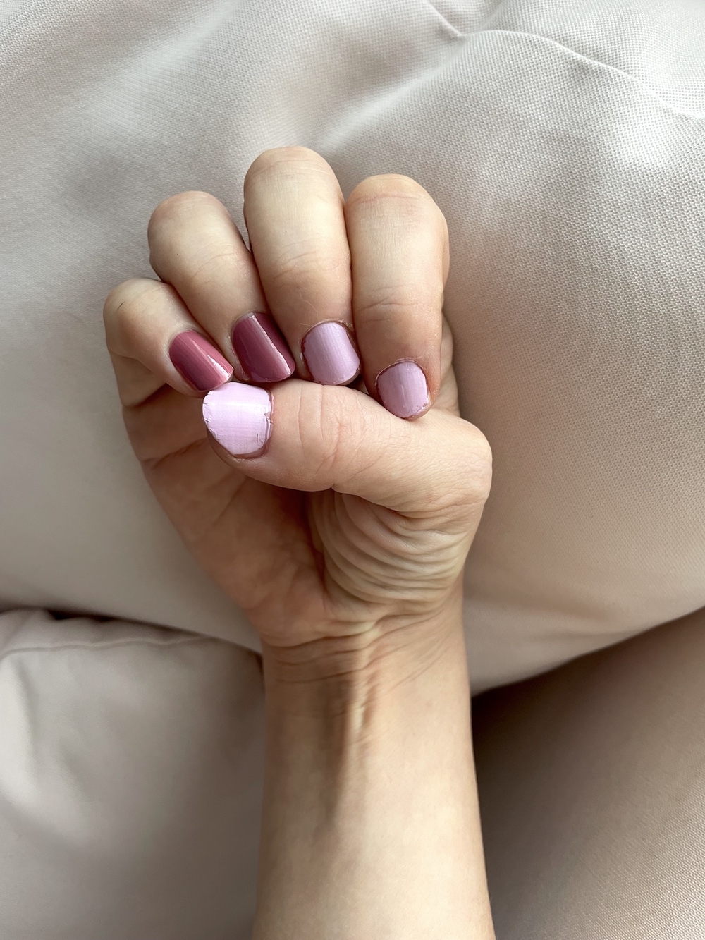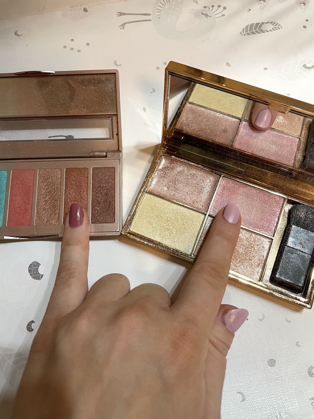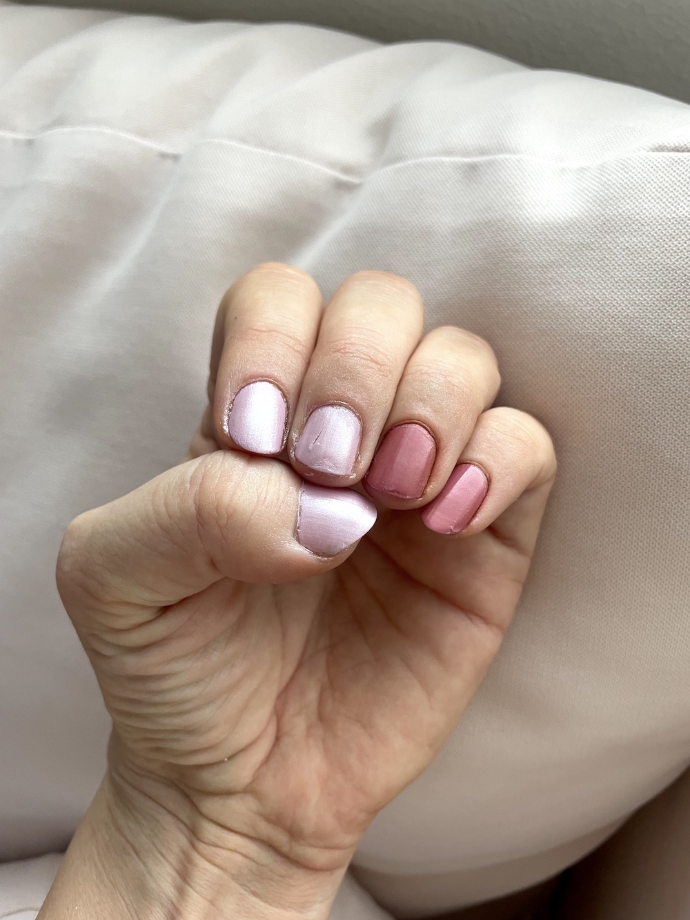 Tässä kuvassa etusormessa on sekä vaaleanpunaista että ruskeaa luomiväriä, ja lopputulos ei ole niin kaunis. Nimettömässä on vaaleanpunaista ja beigeä luomiväriä, eikä sekään näytä kovin kauniilta.