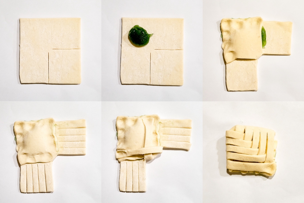- Viillä kaksi viiltoa kahden vierekkäisen sivun keskeltä lähes taikinaneliön keskikohtaan asti.