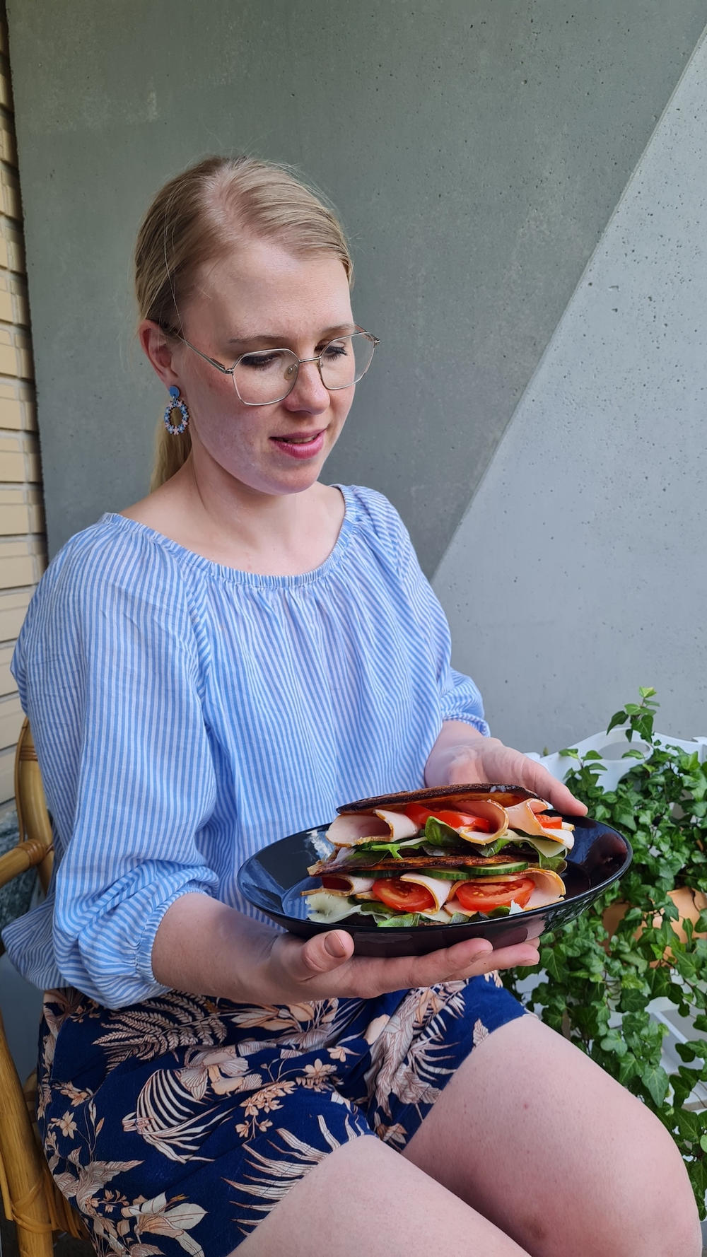 Voit valita flatbreadin täytteiksi omat suosikkitäytteesi. Me pujautimme leipien sisään kalkkunaa, juustoa, salaattia, kurkkua, tomaattia ja hieman kevytmajoneesia. Tulen jatkossa valmistamaan raejuusto-flatbreadia erityisesti kevyenä lounaana erilaisilla variaatioilla.