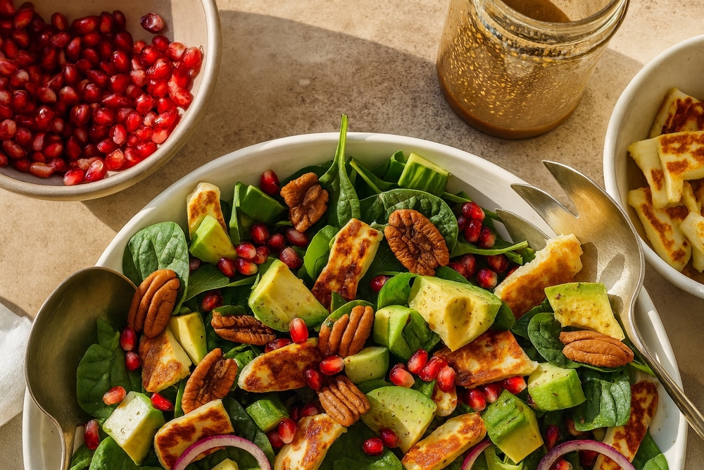 Tämä salaatti on helppo ja näyttävä. Halloumin suolaisuus ja granaattiomenan raikkaus tekevät annoksesta kevyen mutta silti täyttävän. Salaatti sopii arkeen, viikonloppuun tai jopa joulupöydän raikkaaksi lisukkeeksi.