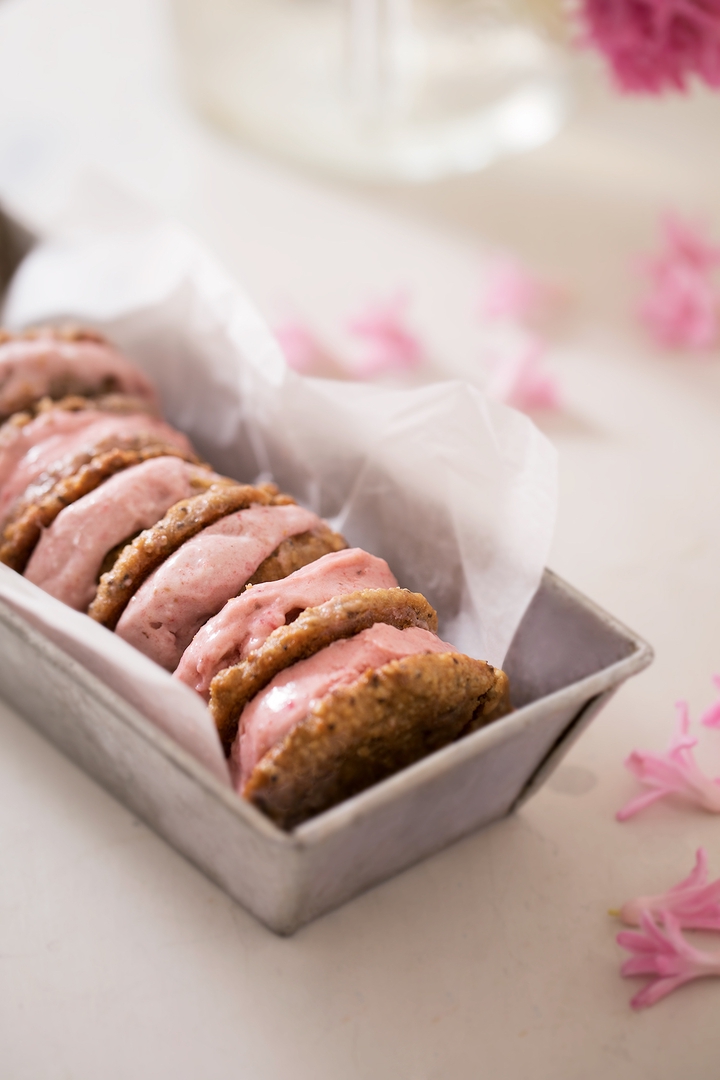 Valmista mansikka nice cream. Laita jäiset mansikat ja banaanipalat tehosekoittimeen. Lisää kookosmaito ja vaahterasiirappi. Sekoita kovalla teholla. Voit välillä pysäyttää tehosekoittimen ja kaapia aineksia reunoilta keskelle, jotta lopputulos olisi tasainen. Täytä jäähtyneet keksit mansikka nice creamilla ja laita pakastimeen jähmettymään vielä vähintään puoleksi tunniksi, jotta jäätelö pysyy keksien sisällä.