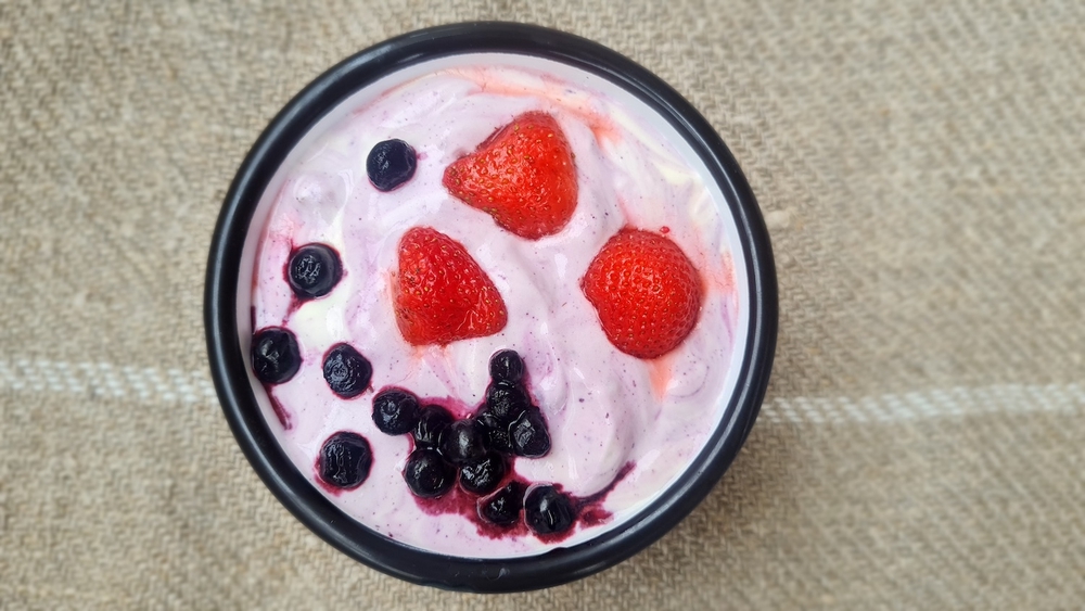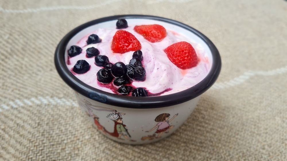 Vispaa vaahtoutuva vaniljakastike tai vispikerma kulhossa paksuksi vaahdoksi. Sekoita varovasti joukkoon maitorahka, halutessasi sokerit ja lopuksi marjat. Koristele annos marjoilla ja halutessasi mintun lehdillä.