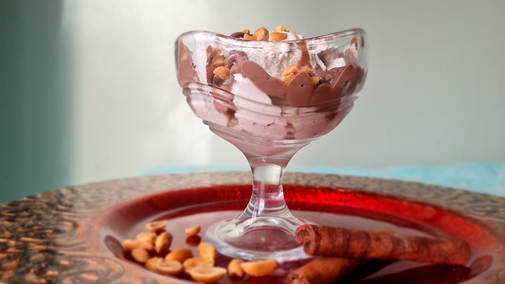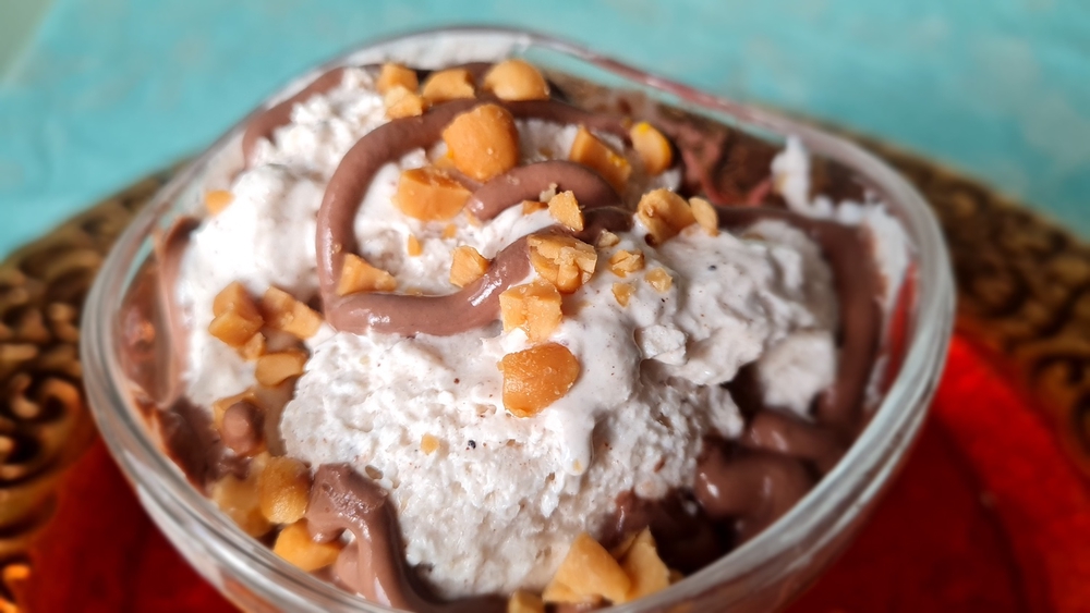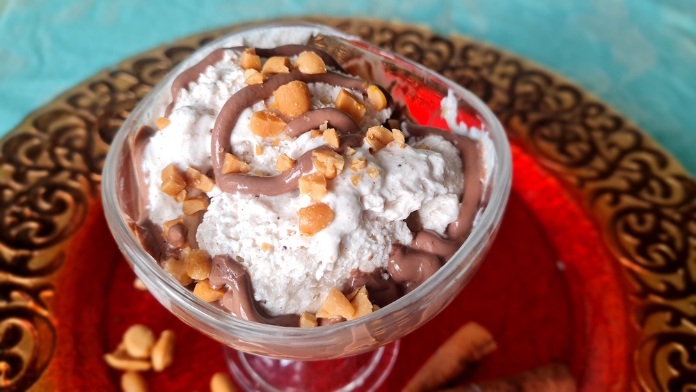 Frozen yogurt taipuu syksyiseksi ja talviseksi herkuksi oikeilla maustevalinnoilla. Tässä reseptissä taivaallinen makumaailma syntyy kanelilla, kardemummalla, inkiväärillä ja neilikalla. Päälle vielä suklaa- tai kinuskikastiketta ja suolapähkinöitä, ja voimme luvata, että herkutteluhetki vie kielen mennessään! Jälkiruoka on niin hyvää, että sitä on suorastaan pakko ottaa lisää.