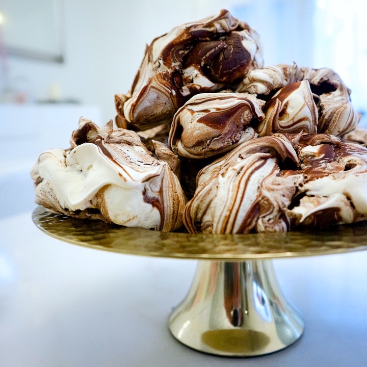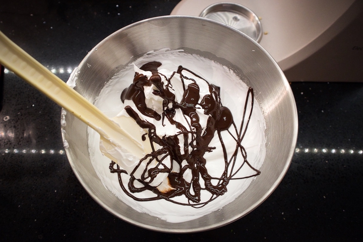 Sulata paloiteltu suklaa miedolla teholla mikroaaltouunissa. Valuta sula suklaa ohuena nauhana valkuaisvaahdon joukkoon ja kääntele se varovasti marenkimassaan esimerkiksi nuolijan avulla niin, että se jää raidoiksi eikä värjää koko massaa. Ole nopea, muutama kääntelykerta riittää.