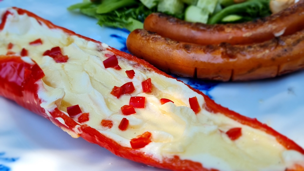Tässä ohjeessa grilliin valitaan suippopaprika, jonka muoto muistuttaa halkaistuna venettä. Tuorejuustoa tulee myös käytettyä melko maltillisesti, sillä halkaistu suippopaprika ei ole kovin syvä. Tällöin vatsaan voi todennäköisemmin jäädä tilaa myös muille grilliherkuille.
