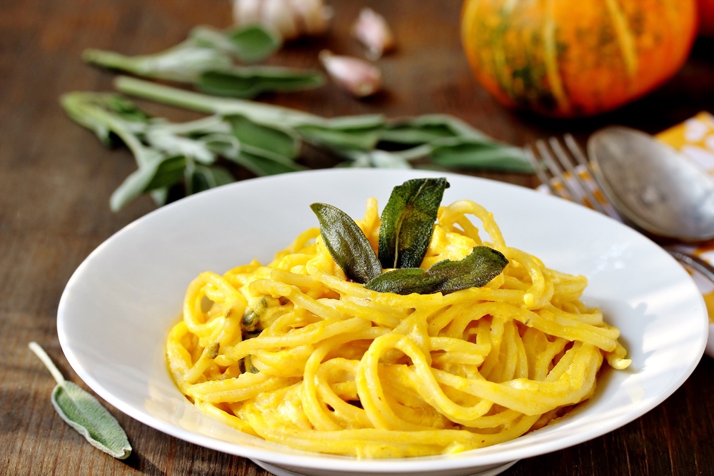Kurpitsasta syntyy kermaisen täyteläinen pastakastike, joka saa italialaista vivahdetta salvian aromista. Kurpitsapasta on täydellinen arkiruoka.