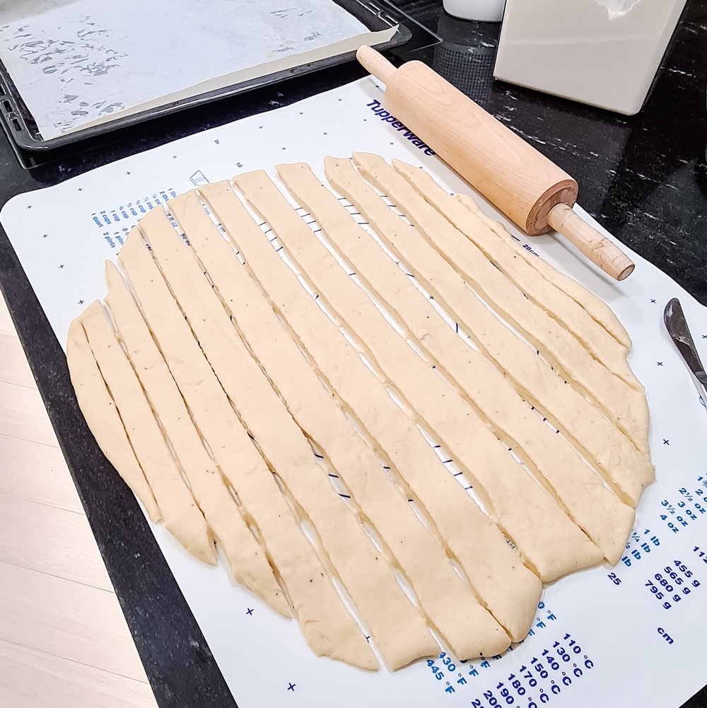 - Kun taikina on kohonnut, kaada se jauhotetulle pöydälle ja vaivaa tasaiseksi palloksi. Kauli sentin paksuksi matoksi. Leikkaa matosta muutaman sentin levyisiä suikaleita.
