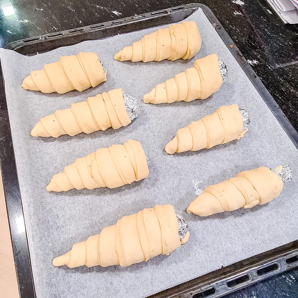 - Muotoile foliosta napakoita tuuttimuotteja sillä välin, kun taikina kohoaa. Voitele muotit ohuelti rasvalla, jottei taikina tartu niin kovaa kiinni.