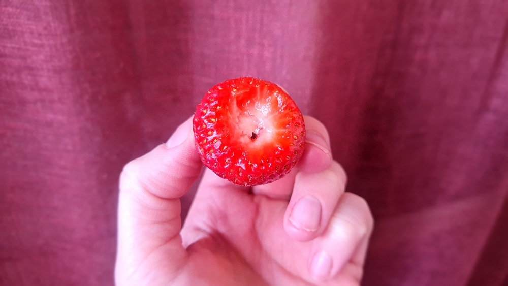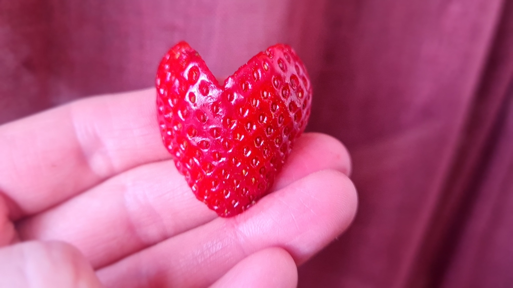 - Halkaise marjat keskeltä kahtia. Muotoile veitsellä v-kirjain kohtaan, josta poistit kannan. Voit pyöristää veitsellä hieman muotoa. Näin mansikka näyttää sydämeltä.