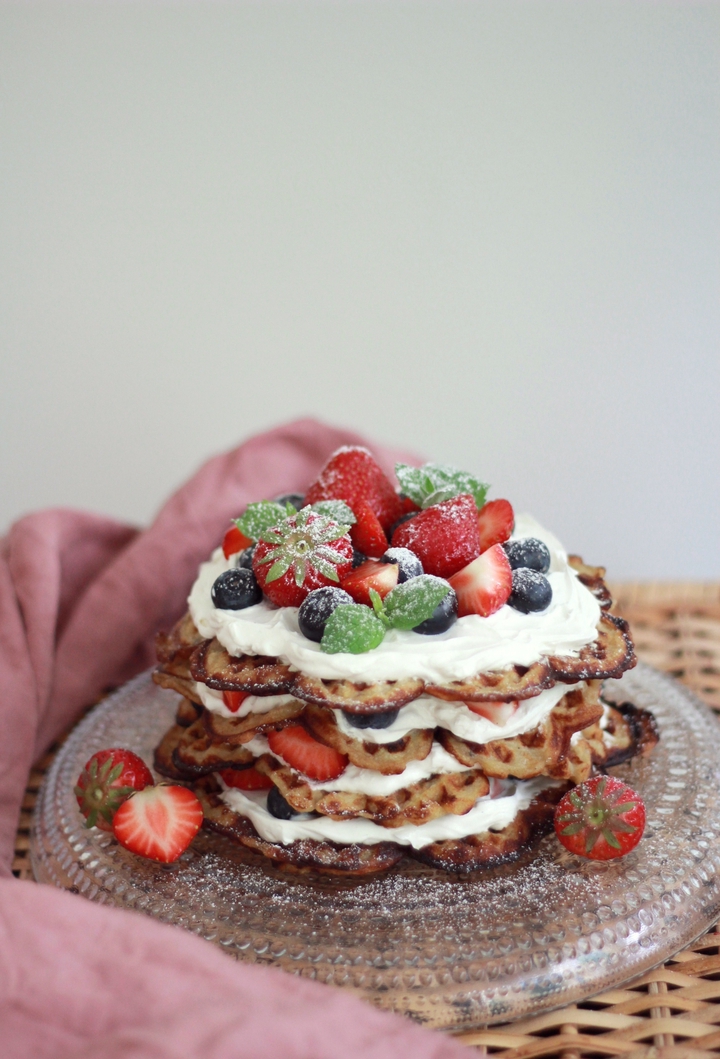 Kokoa vohvelikakku kerros kerrokselta vohveleista, vaniljakermasta ja tuoreista marjoista makusi mukaan. Koristele tomusokerilla, mintun lehdillä ja marjoilla.