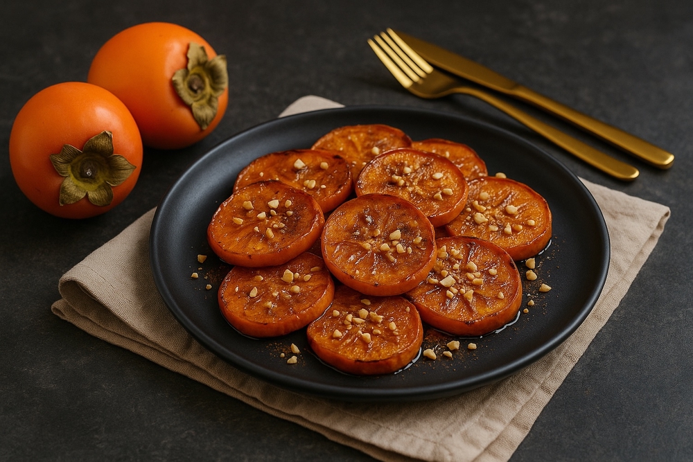 Uunissa lämmitetty persimon saa lähes karamellisoituneen pinnan, ja sen makeus syvenee entisestään. Tämä jälkiruoka syntyy viidessätoista minuutissa ja maistuu sellaisenaan tai vaniljajäätelön kanssa.
