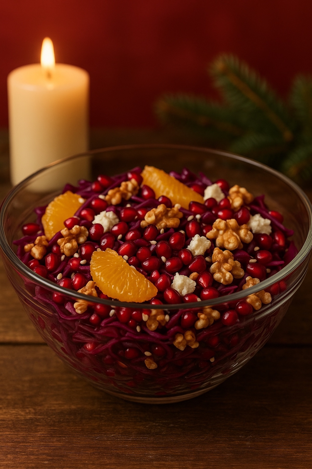 Tässä versiossa punakaali saa seurakseen klassisia joulun makuja: makeaa appelsiinia, kirpeää granaattiomenaa ja paahdettuja pähkinöitä. Salaatti on yhtä aikaa juhlava ja helppo valmistaa, täydellinen esimerkiksi joulupöytään tai glögijuhliin.