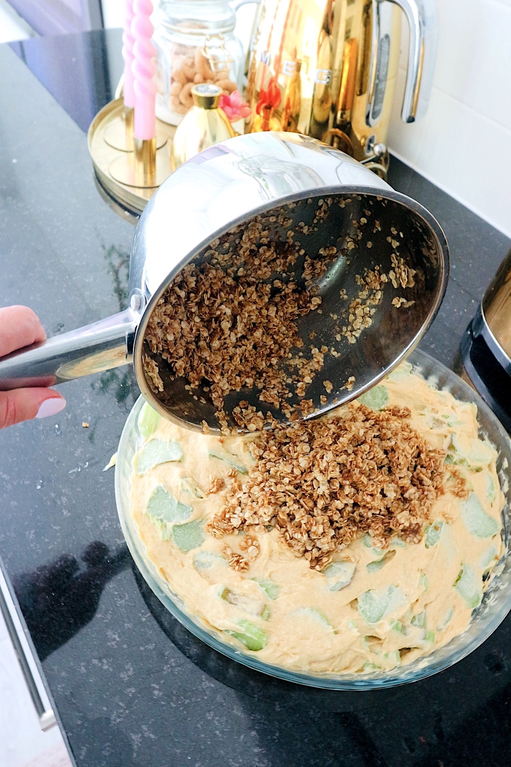 6. Kääntele raparperinpalat nuolijan avulla taikinan joukkoon.