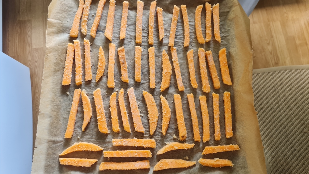 Huomasin nopeasti, että olen aiemmin jättänyt useamman tärkeän vaiheen väliin. Oleellisin niistä on tärkkelys, nimittäin bataattiranskalaiset kannattaa pyöritellä esimerkiksi maissitärkkelyksessä ennen uuniin laittamista.