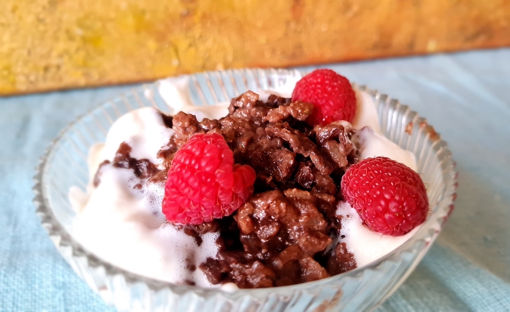 Kun puuro on lähes valmista, sulata joukkoon tumma suklaa. Tuloksena on suklainen riisipuuro, jota voit tarjoilla vaikkapa kermavaahdon tai tuoreiden marjojen kanssa.