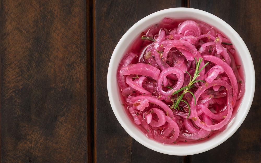 Tarvitset yhden punasipulin, joka viipaloidaan ohuiksi renkaina. Liemi syntyy vedestä, etikkaa, sokerista ja suolasta. Kun kuuma liemi kaadetaan sipulin päälle, rakenne pehmenee nopeasti ja maku pyöristyy. Parhaimmillaan se on tunnin “levättyään”, mutta valmiina jo kymmenessä minuutissa.