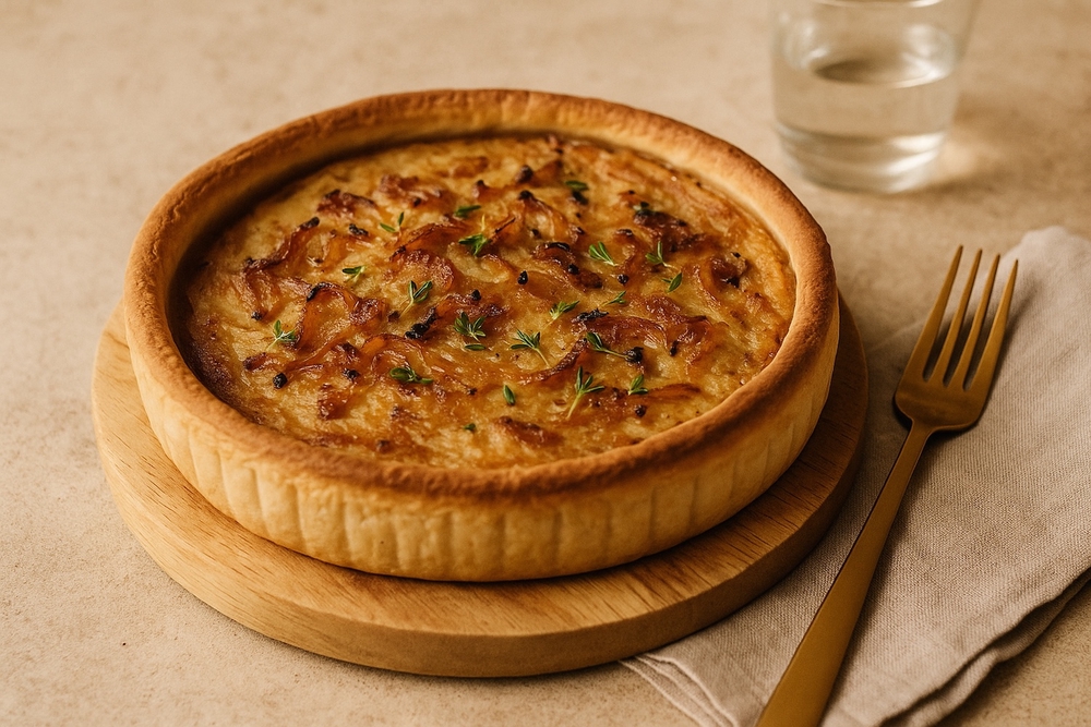 Tämä piirakka on täydellinen yhdistelmä karamellisoitunutta sipulia, pehmeää täytettä ja rapeaa pohjaa. Se sopii arkeen ja juhlaan.