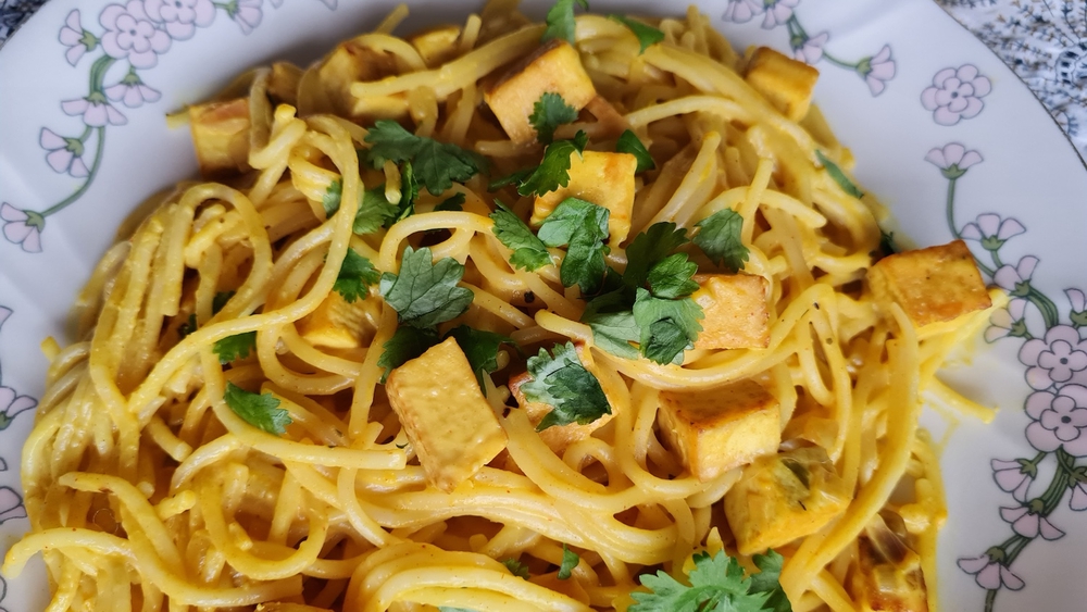 Sekoita valutettu spagetti kastikkeen joukkoon, mausta suolalla ja mustapippurilla. Viimeistele korianterilla ja halutessasi vegejuustoraasteella.