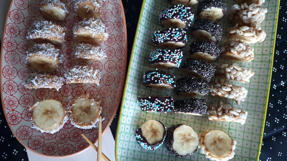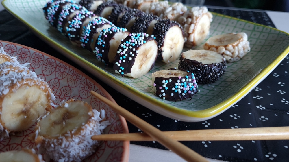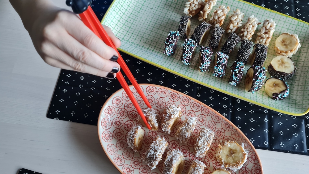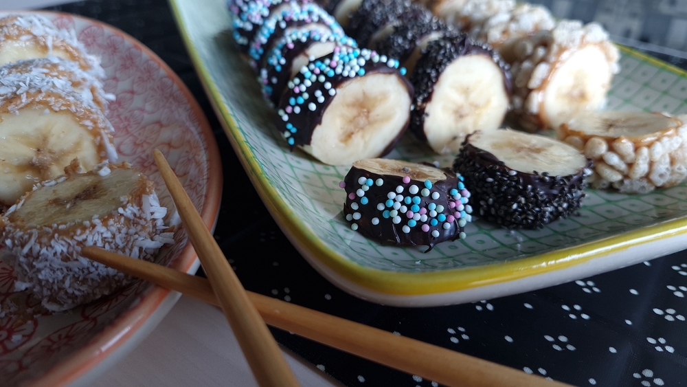 Susheja muistuttavat banaaniherkut toimivat arkea kohottavana välipalana tai terveellisempänä jälkiruokana. Ne ilahduttavat myös vaikkapa perheen leffaillan herkkuna tai naposteltavana lapsivieraille. Samalla on hauskaa harjoitella syömäpuikkojen käyttöä, jos sellaiset kotoa sattuvat löytymään.