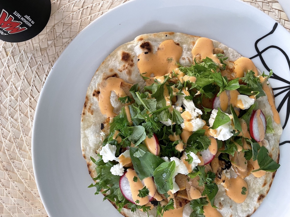Laita levyille creme fraichea, guacamolea (tai paloiteltua avokadoa), kanasuikaleita, jotka ovat maustettu Crispy Chicken -mausteseoksella uunissa (helppo tehdä), friseesalaattia, kurkkua, silmusalaattia, paahdettua sipulirouhetta ja korianteria ja päälle sriracha-majoneesia.