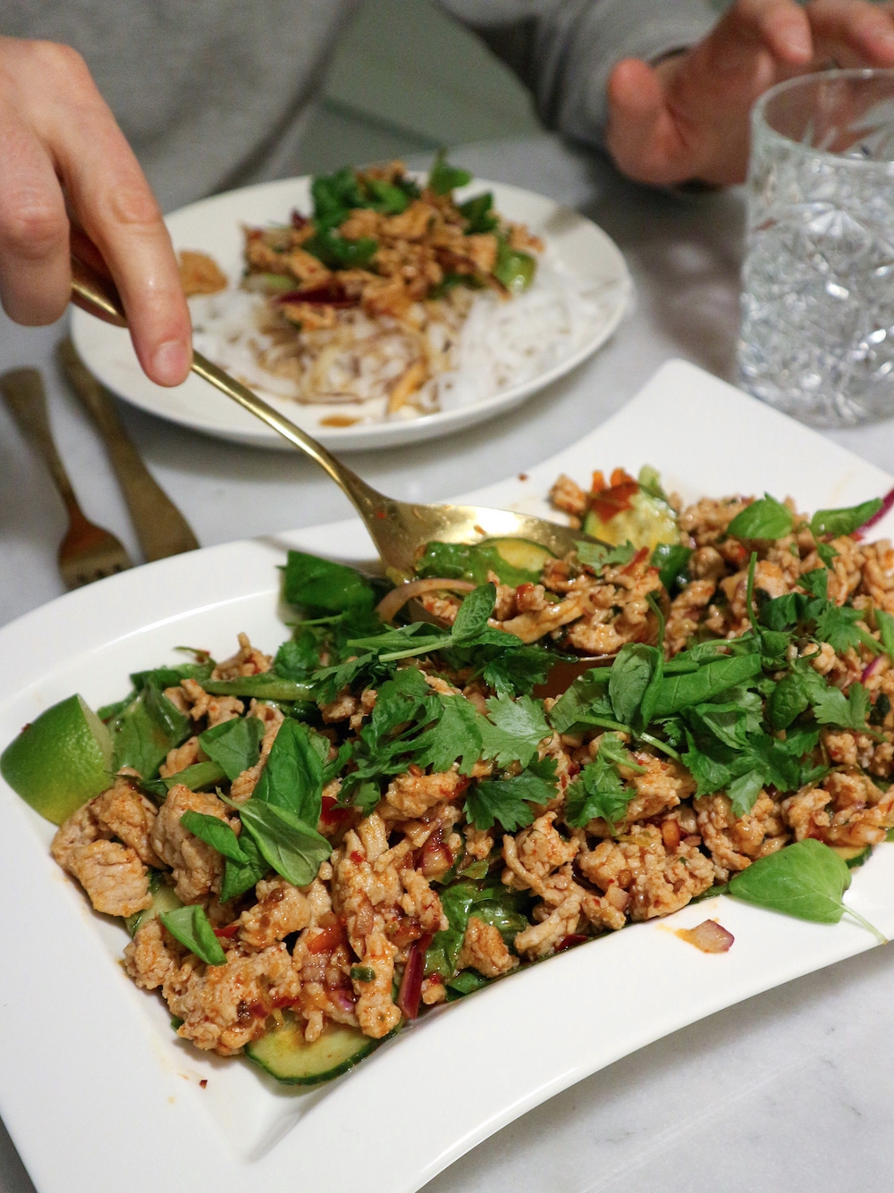 Asettele sekoittamasi salaatti tarjoiluastiaan ja kaada sen päälle jauheliha. Asettele päällimmäiseksi kasa korianteria sekä minttua ja muutama limen lohko. Nauti heti, halutessasi riisin tai nuudelien kera.