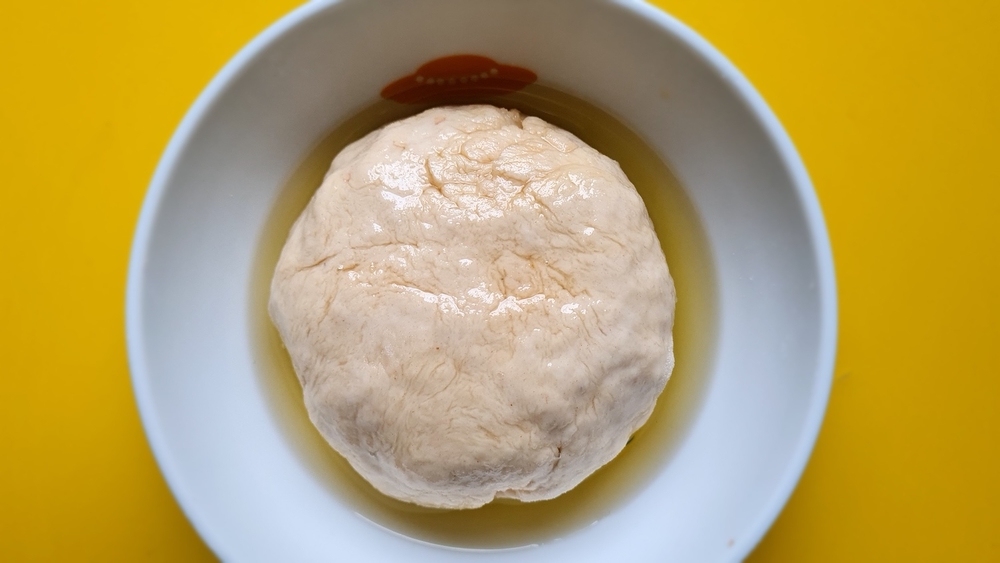 Laita taikina kulhoon, lorauta päälle oliiviöljyä ja peitä liinalla. Anna taikinan levätä noin 20 minuuttia.