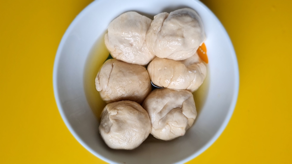 - Ota taikinapallo jauhotetulle alustalle ja jaa se kuuteen yhtä suureen osaan. Pyörittele niistä palloja, laita takaisin kulhoon.