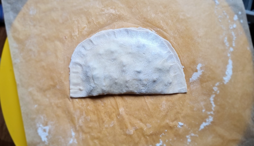- Lisää reilu desi täytettä jokaisen kaulitun taikinalevyn puolikkaalle niin, että reunoille jää noin kaksi senttiä tyhjää tilaa. Käännä tyhjä puoli kanneksi niin, että gözleme on puolikuun muotoinen. Painele pehmeästi niin, ettei sisälle jää ylimääräistä ilmaa. Kostuta peukalosi vedellä ja tiivistä lihapiiraan reunat. Siirrä esimerkiksi uunipellille ja peitä liinalla.