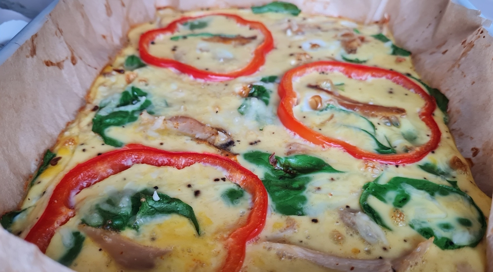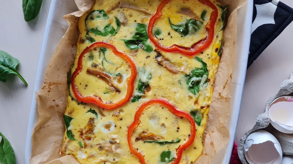Tuore pinaatti sopii broilerin makupariksi ja ympyrän muotoon leikatut paprikat tuovat väriä ja lisää makua uunimunakkaaseen. Tämä resepti sisältää juustoraastetta, mutta halutessasi voit vaihtaa sen juustonmakuiseen ruokakermaan. Joka tapauksessa moni kaipaa munakkaalta juuri suloista juustoisuutta, jota tässä munakkaassa on sopivasti.