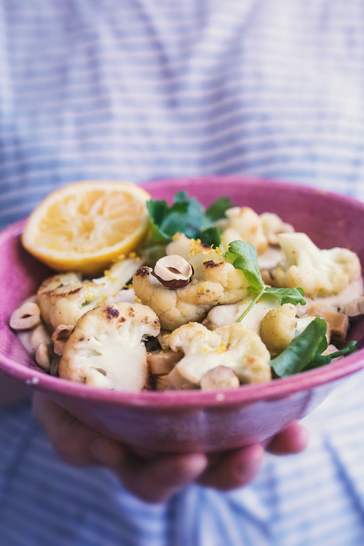 Valmista ensin kastike. Kuutioi sipuli ja valkosipuli. Paloittele puolet kukkakaalista pineksi muruksi ja loput hieman suuremmiksi paloiksi. Kuullota sipulia, valkosipulia ja hienoksi paloiteltuja kukkakaaleja paksupohjaisessa kattilassa oliiviöljyssä kunnes kukkakaalit ovat hieman pehmenneet. Lisää kaurakerma ja anna seoksen porista miedolla lämmöllä kannen alla kunnes kukkakaalit ovat täysin kypsiä. Soseuta seos sauvasekoittimella tasaiseksi ja mausta suolalla, mustapippurilla ja sitruunamehulla.